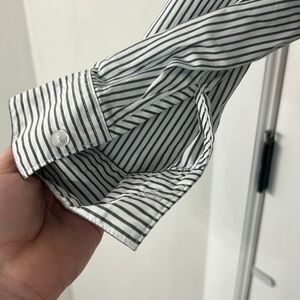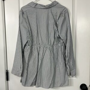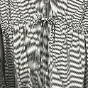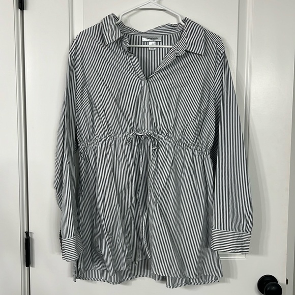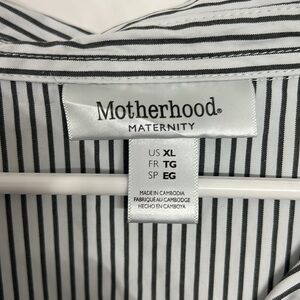 Motherhood maternity top. Never worn, EUC. Has 3/4button down on top, elastic middle with tie. Can roll sleeves up. Cute! Stripes are a dark gray & white