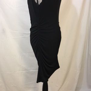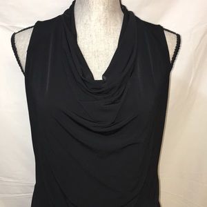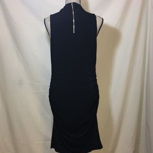 Gorgeous fitted black maternity dress to show off that baby bump. Lined, sleeveless, cowl neck, knee length & zips in back. Gathered through the hips on each side. No flaws found. Machine wash & dry.