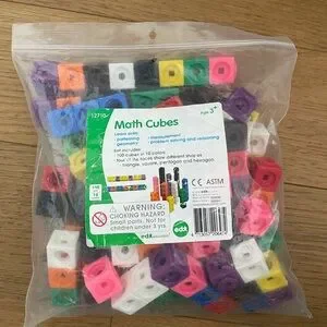 Bag of interlocking math cubes in multiple bright colors. Includes cubes in purple, pink, white, green, yellow, blue, orange, red, black, and tan. Great for counting, patterning, and hands-on math play.