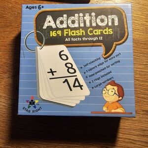 Set of math flash cards with addition problems. Includes a metal ring for easy organization. Perfect for learning and practice.