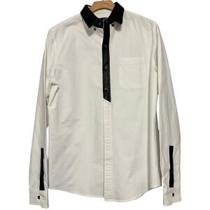 Matiere Men’s Size S White Cotton Black Leather Trim Button Down Long Sleeve Shirt