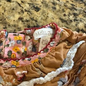 Adorable Matilda Jane romper with floral design. Features tan and red hues. Ideal for fun outings.