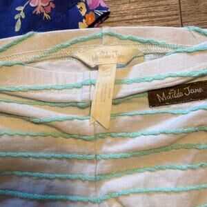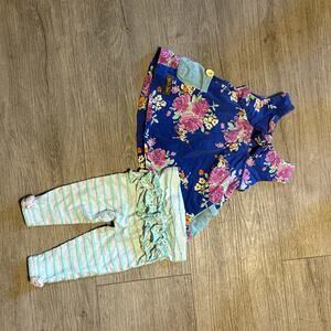 This Matilda Jane outfit set is in excellent condition and ready for your little one! The floral swing top features sweet ruffles on the bottom, while the striped leggings have adorable bow ties on the ankles. The top also has pockets with button detail and a criss-cross design in the back. This set is perfect for your 12M baby girl!