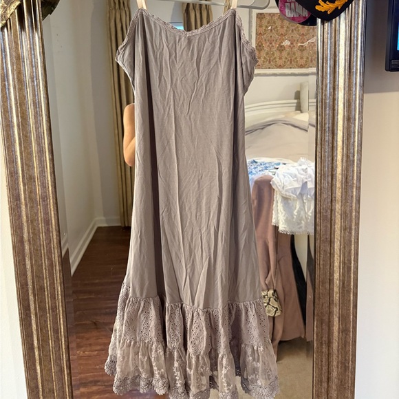 Chic taupe midi dress with delicate straps. Features a stylish lace hem. Perfect for casual outings.