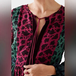 Features a gorgeous floral print, long sheer sleeves, velour detailing and tie front at the chest, back tie sash and an above the knee high low fit.