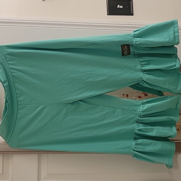 Stylish aqua pants with ruffle hem. Comfortable and chic. Grabbed this color because I thought I might be able to wear them to school with fun tees. I just don’t wear this color enough to keep them. Never wore them once I purchased them. Only washed them and hung them to dry.