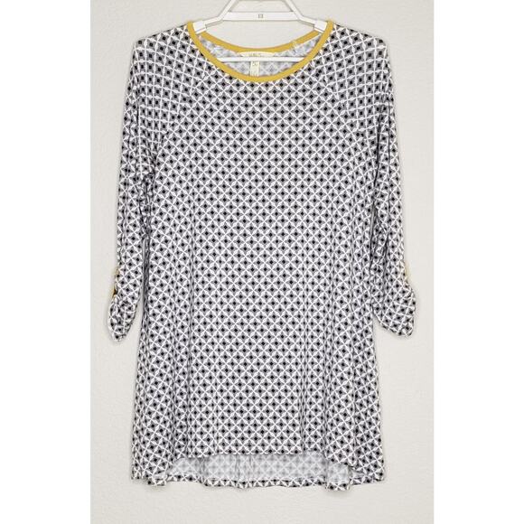 Women's Matilda Jane Believe Starstruck Tunic Top Gray Print W/ Yellow Trim Long Tab Sleeve Size Small Stretch