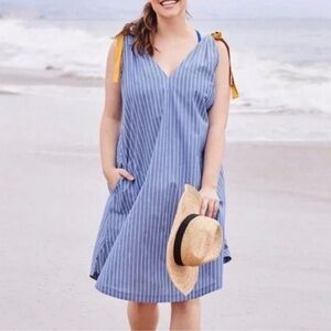 This stylish striped blue dress features vibrant yellow accents, perfect for a sunny day out. Enjoy the comfort and elegance of this chic design.