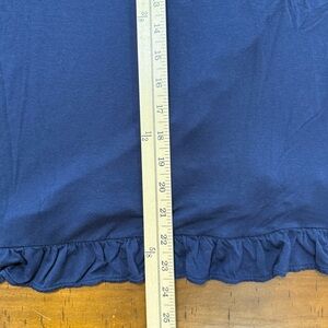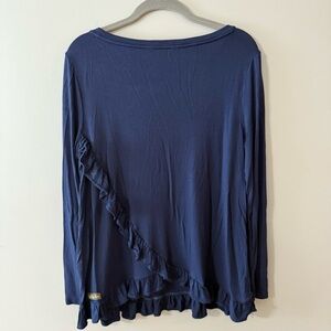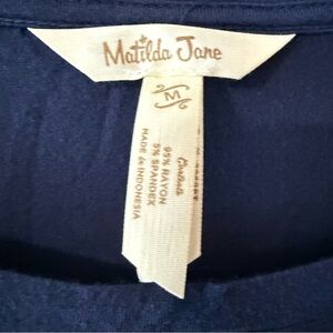 This Matilda Jane blouse features a relaxed fit with a classic crew neckline and long sleeves, crafted in a soft blue fabric. Its simple, elegant design makes it a versatile addition to any wardrobe, perfect for both casual and semi-formal occasions. Size M