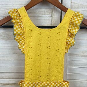 Sunny yellow eyelete pinafore with subtle cornflower blue accent seams and button and yellow and white gingham contrast details