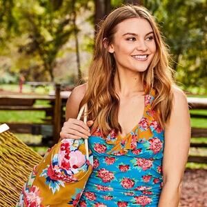 Matilda Jane swimsuit, floral halter top, vintage-inspired swimwear, retro chic, feminine swim top, beach vacation, pool party, resort wear, summer getaway, tropical floral tankini, flattering ruched swim top