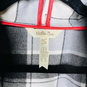 Soft Fabric open Front Plaid Cardigan Jacket by Matilda Jane. Colors are Black Gray and White. Belted with Front Pockets and sleeves are lined. Approx measurements pit to pit 23”, Length from Shoulder to Hem 35”. Excellent Condition 🚭