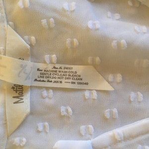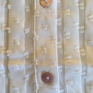 "Matilda Jane" cream textured cap sleeve top with ruffle and lace detailing; pink button detail on the back. Gently used.