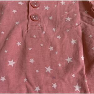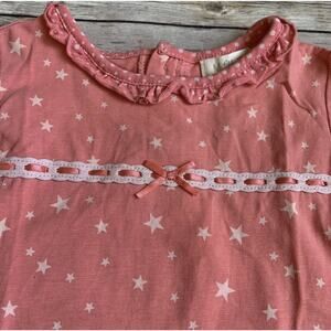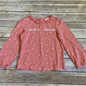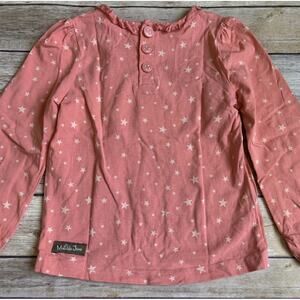 Size 2, Matilda Jane, Eisly Top from the Fall 2015 Friends Forever collection. Long sleeve coral pink top with white star print all over. Ruffled neckline. Ribbon embellishment woven across the chest. This top is in great condition with the exception to blue dye stain spots. See close up photos.
