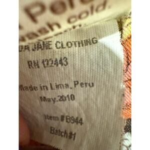 These adorable Matilda Jane pants are a must-have for any collector or fan! Part of the Field Trip collection from Fall 2010, these vintage beauties feature a dark brown base with a charming floral print in orange, pink, and green, finished with playful ruffle hems and contrasting blue lace trim. Made in Peru, these pants have an elastic waistband and a comfy pull-on style for easy wear.
