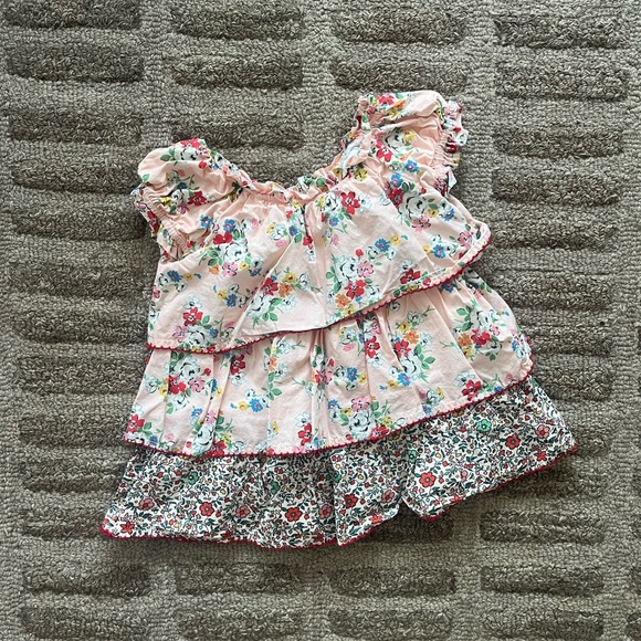 Adorable top with floral print and ruffle details. Features a mix of pink, red, and green colors. Never worn.