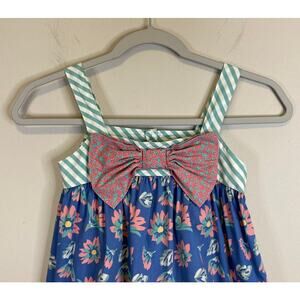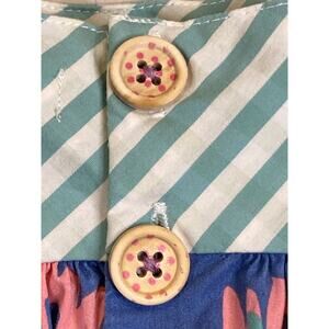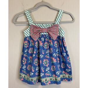 This sweet girl's tunic top has a mix of pattern prints, with large bow on front. It features 2 larger buttons on back with an adorable ribbon trim at bottom with owls and foxes.