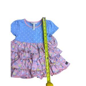 Adorable Matilda Jane girls boutique dress in Size 4. This sweet and whimsical dress features a light blue polka dot bodice with pink trim, puff sleeves, and a tiered ruffle skirt covered in colorful birthday cake and teapot prints. The layered ruffles with contrasting stitching give it that signature Matilda Jane boutique charm.