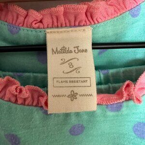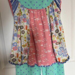 Adorable Matilda Jane girls' size 8 two-piece pajama/lounge set featuring bright patchwork prints, ruffle hems, and flutter sleeves. This set captures Matilda Jane’s signature whimsical, colorful style. Soft, lightweight, flame-resistant fabric perfect for sleep or cozy day wear.
