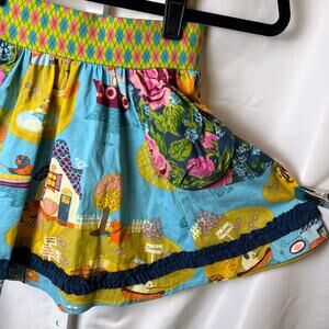 Matilda Jane, Paint By Numbers Gallery Skirt, girls size 6, cottagecore, whimsical, storybook village, woodland animals, fox, cottage houses, garden carrots, hot air balloon, novelty scenic print, floral pockets, yellow plastic buttons, argyle waistband, flared silhouette, ruffle hem, boutique kids clothing, 2013 collection, collector piece