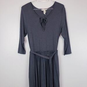 Flattering charcoal gray maxi dress with subtle high-low hem, v-neck, POCKETS, and tie waist. Another buttery soft cotton jersey dress you can dress up or down. With its elasticized waist it’s simple, classic, and oh so comfortable!