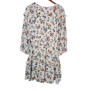 Matilda Jane Good Hart Tarpon Springs Floral Dress in White. Size S / Small. Features V-neck with tie closures, 3/4 sleeves with elastic cuffs, ruffle accents, tiered construction, floral print, and mini length. 100% Rayon. NWT / New with tags.