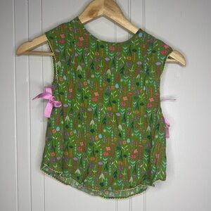 Embrace a touch of nature with the Matilda Jane blouse, featuring a vibrant green base adorned with delightful floral motifs and pink ribbon accents. This loose-fitting top offers a comfortable and casual texture, perfect for everyday wear. The whimsical design, inspired by garden themes, adds a cheerful flair to your wardrobe