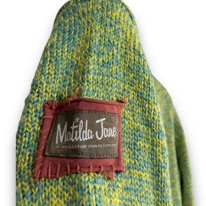 ‘Matilda Jane’ vibrant green blue multi color knit long line cardigan v-neck sweater featuring long sleeves, right sleeve has an upper logo stitch patch, 2 front pockets and button up closure with hella cool unique snazzy funky button engraved designs on each in size medium. Ultra cozy and warm, perfect for casual street wear. This stretchy woven colorful boho vibes cardigan sweater is in excellent pre owned condition.