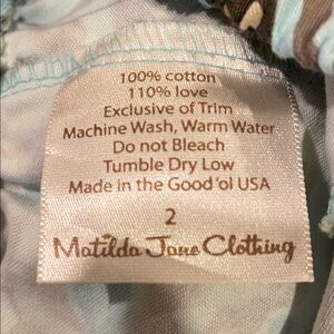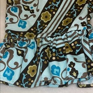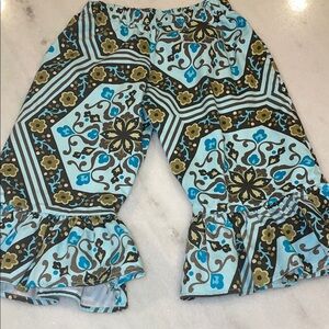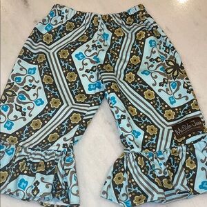 Adorable ruffle bottoms with floral pattern. Features blue and brown colors. Perfect for casual wear. There is one pick in the material on the back of the pants near the ruffle see picture. This is not a hole that goes all the way through other than this is these pants would be in perfect condition. Smoke free home.