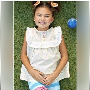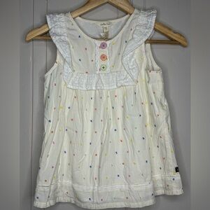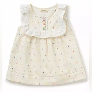 Charming white top with playful colorful dots. Features a ruffled collar and decorative buttons.