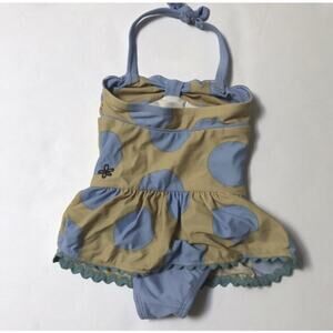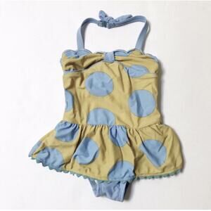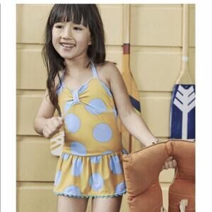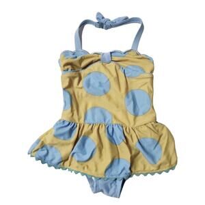 Matilda Jane Little Dipper one piece skirted swim suit. Mustard yellow with blue polkas dots, halter top style and skirt. Play condition for area with snags on top, otherwise very good condition, no wear to bottom. Size 2.