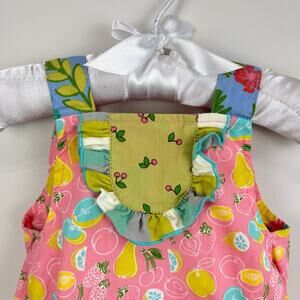 Matilda Jane It's a Wonderful Parade Little Lemon Ruffle Romper. Baby girl size 6 months. The cutest one piece sun suit outfit! Pink with green, blue, and yellow fruit print. Button straps and snaps at the bottom. Layered ruffles around the hips and bum!