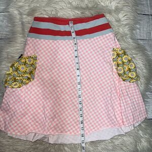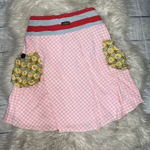 Good, preloved condition. Matilda Jane Clothing MJ Serendipity Pepper Ann Skirt. Pink and white gingham. Stripe elastic waist. Flower pockets. A-Line.