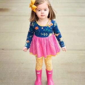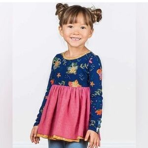 This delightful long sleeve tee from Matilda Jane features a playful floral pattern on a navy blue background, complemented by a contrasting pink swiss dot ruffle detail at the hem. The whimsical design and comfortable fit make it perfect for everyday wear, adding a touch of fun to any outfit.
