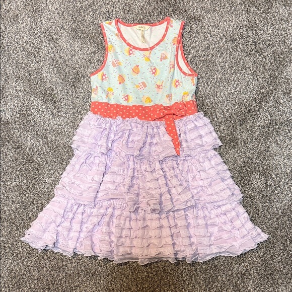 Charming dress with playful patterns. Features a tiered ruffle skirt. Perfect for any occasion.