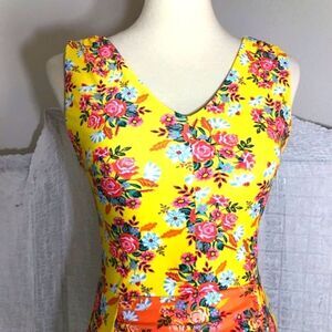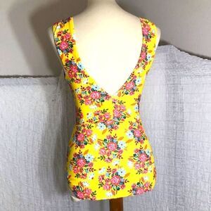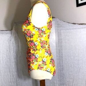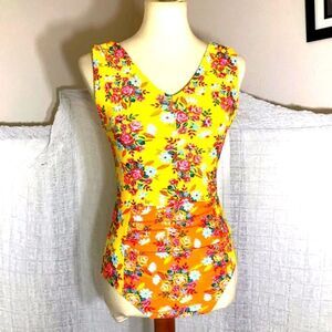 Yellow floral print one piece swimsuit. Ruched detail. Padded. It's new without tags. Please refer to pictures for best description and condition verification.