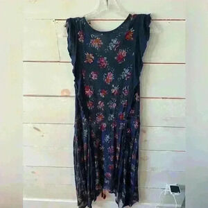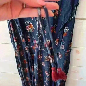 Charming navy dress with floral pattern. Sleeveless design. Asymmetrical hemline. Perfect for casual outings.
