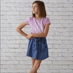 Matilda Jane Oceanside Denim Skirt. In soft chambray denim with button front and floral belted sash. In worn once condition. No flaws.