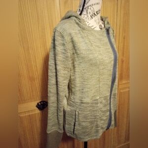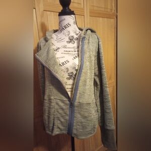 Stylish olive cardigan with navy trim. Features a cozy hood and open front. Perfect for layering. smoke free home