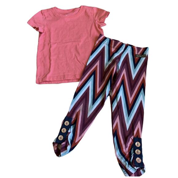 PLEASE READ: DIFFERENT SIZES!! Size 2 Matilda Jane Abba Leggings in chevron print. From the Paint By Numbers line. Paired with a size 3 pink Primary tee. No stains or flaws. Very good used condition. I also have these pants (no shirt) in a size 4 for a sister set match.