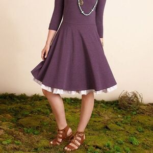 Jersey style, lined with a light purple underskirt which peeks out with a ruffle at the hem. The dress is a comfortable pull over style with an easy travel friendly fabric with a round neck