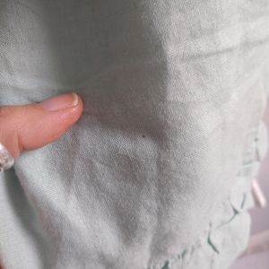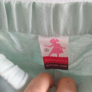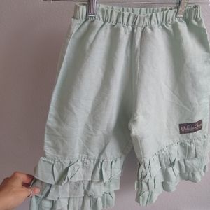 Super cute mint green ruffled Matilda Jane Pants. Size is 4T. They are made of linen and cotton. They are in used condition. They have some marks on them, but as far as I see they are only on the back. There is also some discoloration on the top of waistband going all the way around. Please see pictures.