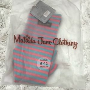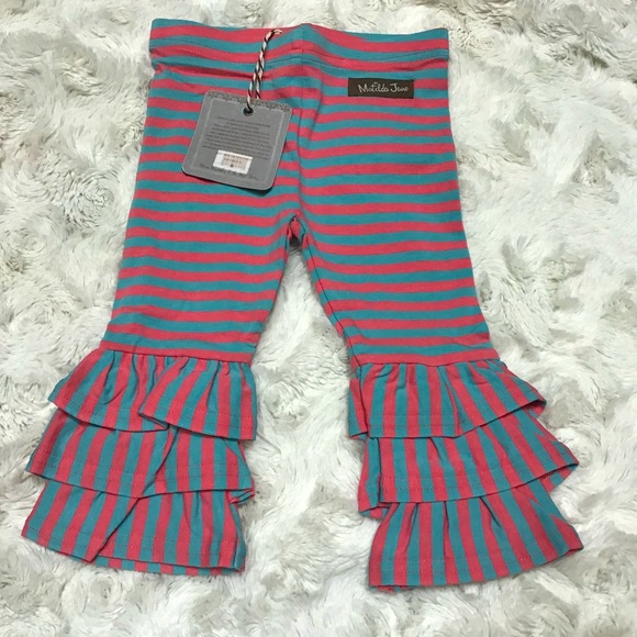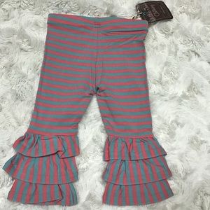 Matilda Jane, pink and blue, ruffled pants. Striped. Available in sizes 6-12 months and 2T.