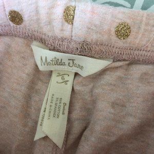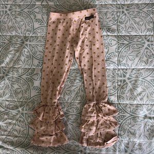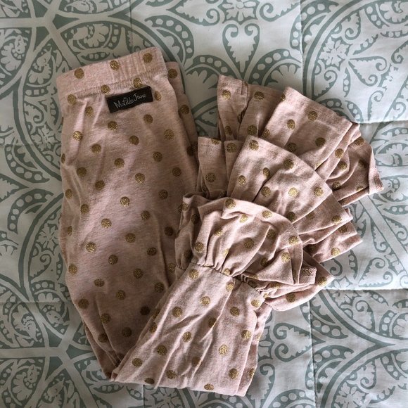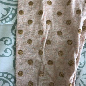 ADORABLE pink and gold glitter polka dot ruffles, they will be a favorite! Small light red stain on knee, shown in pictures - otherwise in great condition.