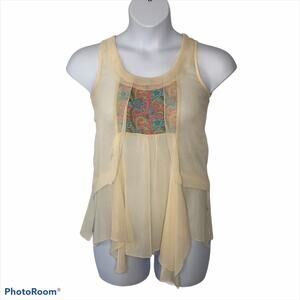 In excellent preowned condition from a smoke-free home, this off-white/cream tunic features a sheer base, an asymmetrical silhouette, and a beautiful boho shabby chic design pattern in the center of the chest. The ruffle front and waterfall fly-away hemline add a touch of femininity.