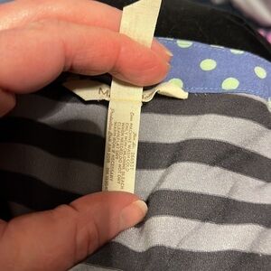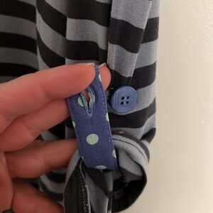 Pre owned nice condition buttery soft light and dark gray stripes blue and green polka dots roll up 3/4 length sleeves with polka dot tab.