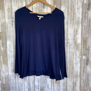 Elegant navy top featuring a stylish ruffle hem. Perfect for casual outings or dressing up. Comfortable and chic for any occasion.
