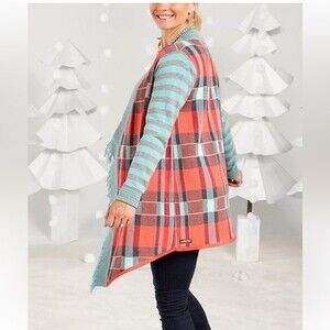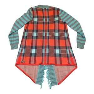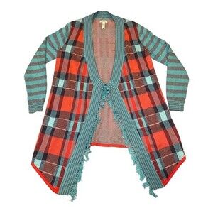 Matilda Jane Steadfast Plaid Open Front Plaid Coral Aqua & Grey Cardigan Size XS