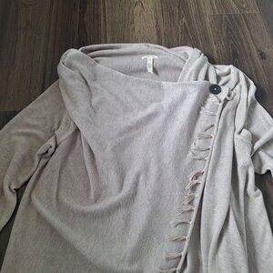 Matilda Jane Tan Asymmetrical Fringe Western Cozy Mid Thickness Wrap Shawl Cardigan.
