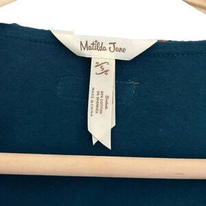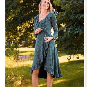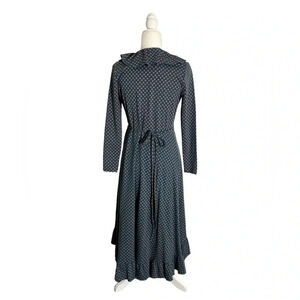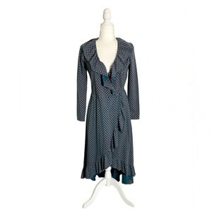 Full front wrap with a tie belt. The ruffle goes around the neckline, down the wrap edge and along bottom hem. High-lo hem. Blue with orange round floral pattern giving it a polka dot look.